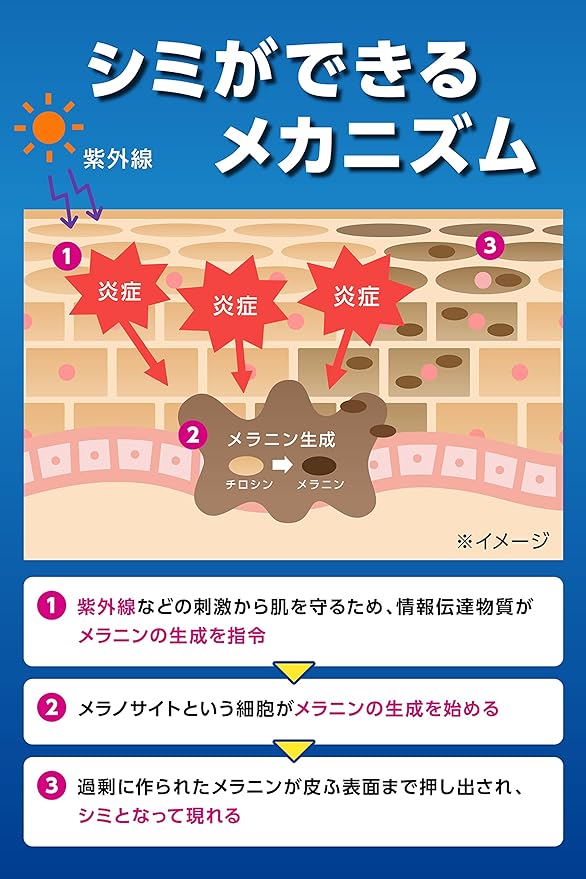 メラニンの生成を抑え、しみ、そばかすを防ぐ。肌あれ。あれ性。あせも・しもやけ・ひび・あかぎれ・にきびを防ぐ。油性肌。かみそりまけを防ぐ。日やけ・雪やけ後のほてりを防ぐ。肌をひきしめる。肌を清浄にする。肌を整える。皮ふをすこやかに保つ。皮ふにうるおいを与える。皮ふを保護する。皮ふの乾燥を防ぐ。