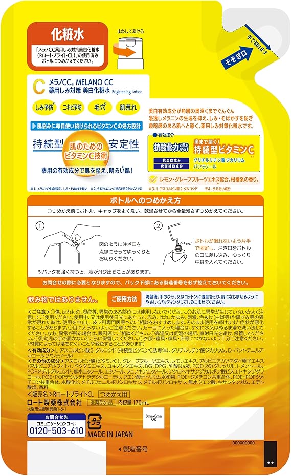 美白有効成分持続型ビタミンC誘導体(L-アスコルビン酸2-グルコシド)、抗炎症成分グリチルリチン酸ジカリウム、代謝補助成分パンテノール(D-パントテニルアルコール)の3つの有効成分が肌の奥まで浸透する薬用化粧水。