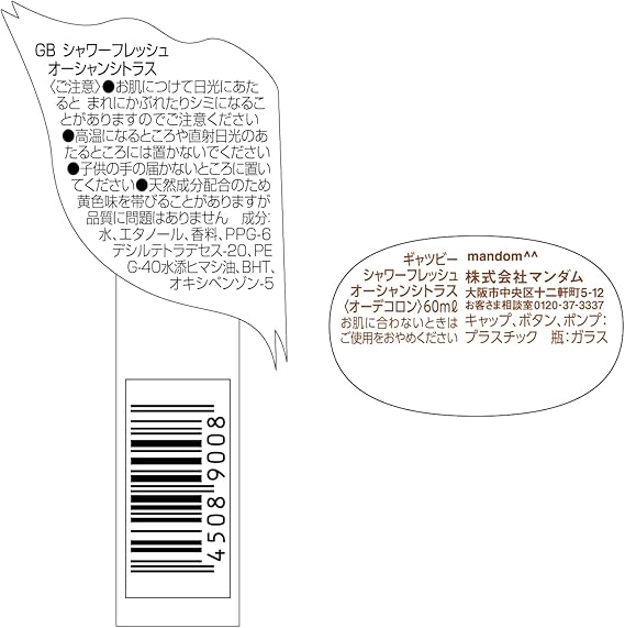 水、エタノール、香料、PPG-6デシルテトラデセス-20、PEG-40水添ヒマシ油、BHT、オキシベンゾン-5