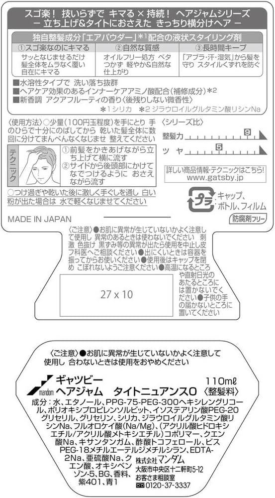 水、エタノール、PPG-75-PEG-300ヘキシレングリコール、ポリオキシプロピレンソルビット、イソステアリン酸PEG-20グリセリル、グリセリン、シリカ、ジラウロイルグルタミン酸リシンNa、フルオロケイ酸(Na/Mg)、(アクリル酸ヒドロキシエチル/アクリル酸メトキシエチル)コポリマー、クエン酸Na、キサンタンガム、酢酸トコフェロール、ビスPEG-18メチルエーテルジメチルシラン、EDTA-2Na、亜硫酸Na、クエン酸、オキシベンゾン-5、BG、香料、紫401、青1