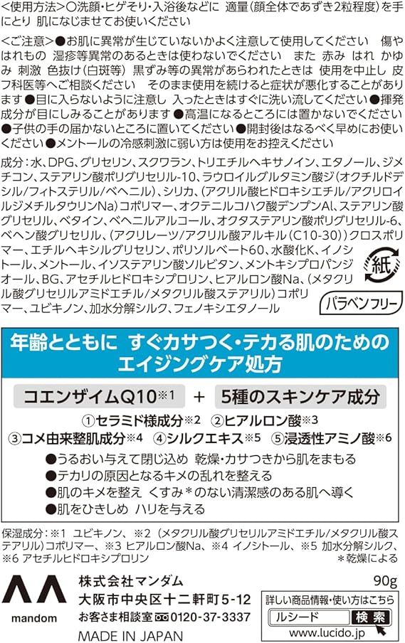 水、DPG、グリセリン、エタノール、スクワラン、トリエチルヘキサノイン、ジメチコン、ステアリン酸ポリグリセリル-10、ラウロイルグルタミン酸ジ(オクチルドデシル/フィトステリル/ベヘニル)、シリカ、(アクリル酸ヒドロキシエチル/アクリロイルジメチルタウリンNa)コポリマー、オクテニルコハク酸デンプンAl、ステアリン酸グリセリル、ベタイン、ベヘニルアルコール、オクタステアリン酸ポリグリセリル-6、ベヘン酸グリセリル、(アクリレーツ/アクリル酸アルキル(C10-30))クロスポリマー、エチルヘキシルグリセリン、メントール、ポリソルベート60、水酸化K、イソステアリン酸ソルビタン、アセチルヒドロキシプロリン、イノシトール、BG、ユビキノン、ヒアルロン酸Na、(メタクリル酸グリセリルアミドエチル/メタクリル酸ステアリル)コポリマー、加水分解シルク、フェノキシエタノール