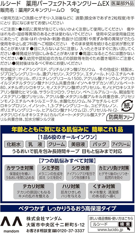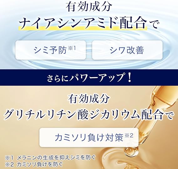 有効成分:ナイアシンアミド その他成分:精製水、ジプロピレングリコール、濃グリセリン、エタノール、スクワラン、デカメチルテトラシロキサン、トリ2-エチルヘキサン酸グリセリル、アクリル酸ナトリウム・アクリロイルジメチルタウリン酸ナトリウム共重合体/イソヘキサデカン/ポリソルベート80、メチルポリシロキサン、モノステアリン酸ポリグリセリル、ポリエチレングリコール1500、サラシミツロウ、ベヘニルアルコール、親油型モノステアリン酸グリセリル、ジペンタエリトリット脂肪酸エステル(1)、アクリル酸・メタクリル酸アルキル共重合体、グリセリンモノ2-エチルヘキシルエーテル、水酸化カリウム、N-アセチル-L-ヒドロキシプロリン、イノシット、1,3-ブチレングリコール、ユビデカレノン、ヒアルロン酸ナトリウム(2)、グリセリル-N-(2-メタクリロイルオキシエチル)カルバメート・メタクリル酸ステアリル共重合体、ポリエチレングリコール、加水分解シルク液