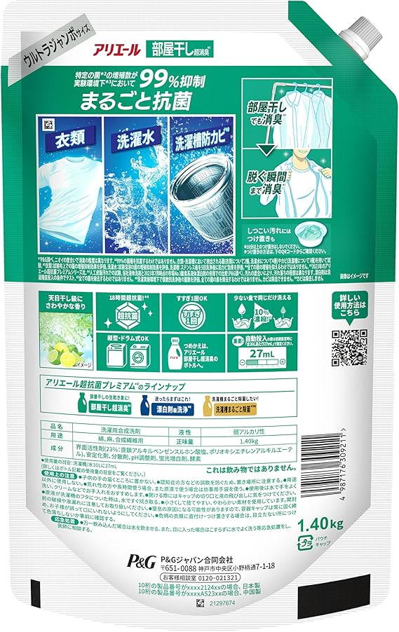 *1 P&G調べ。ニオイの度合いで消臭の程度は異なります。 *2 アリエール超抗菌プレミアムシリーズにおいて。 *3 全ての菌の増殖を抑えるわけではありません。 *4 カビは除去しません。 *5 2023年のアリエール超抗菌プレミアムシリーズ比。