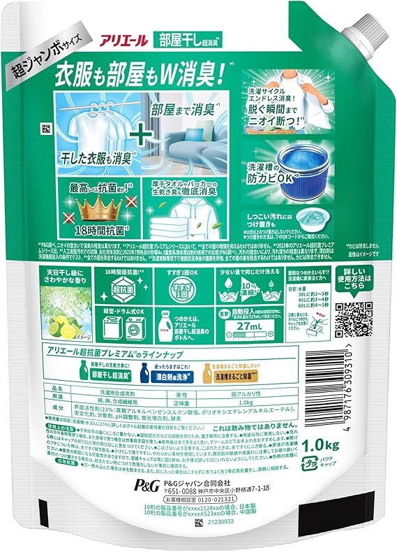 *1 P&G調べ。ニオイの度合いで消臭の程度は異なります。 *2 アリエール超抗菌プレミアムシリーズにおいて。 *3 全ての菌の増殖を抑えるわけではありません。 *4 カビは除去しません。 *5 2023年のアリエール超抗菌プレミアムシリーズ比。