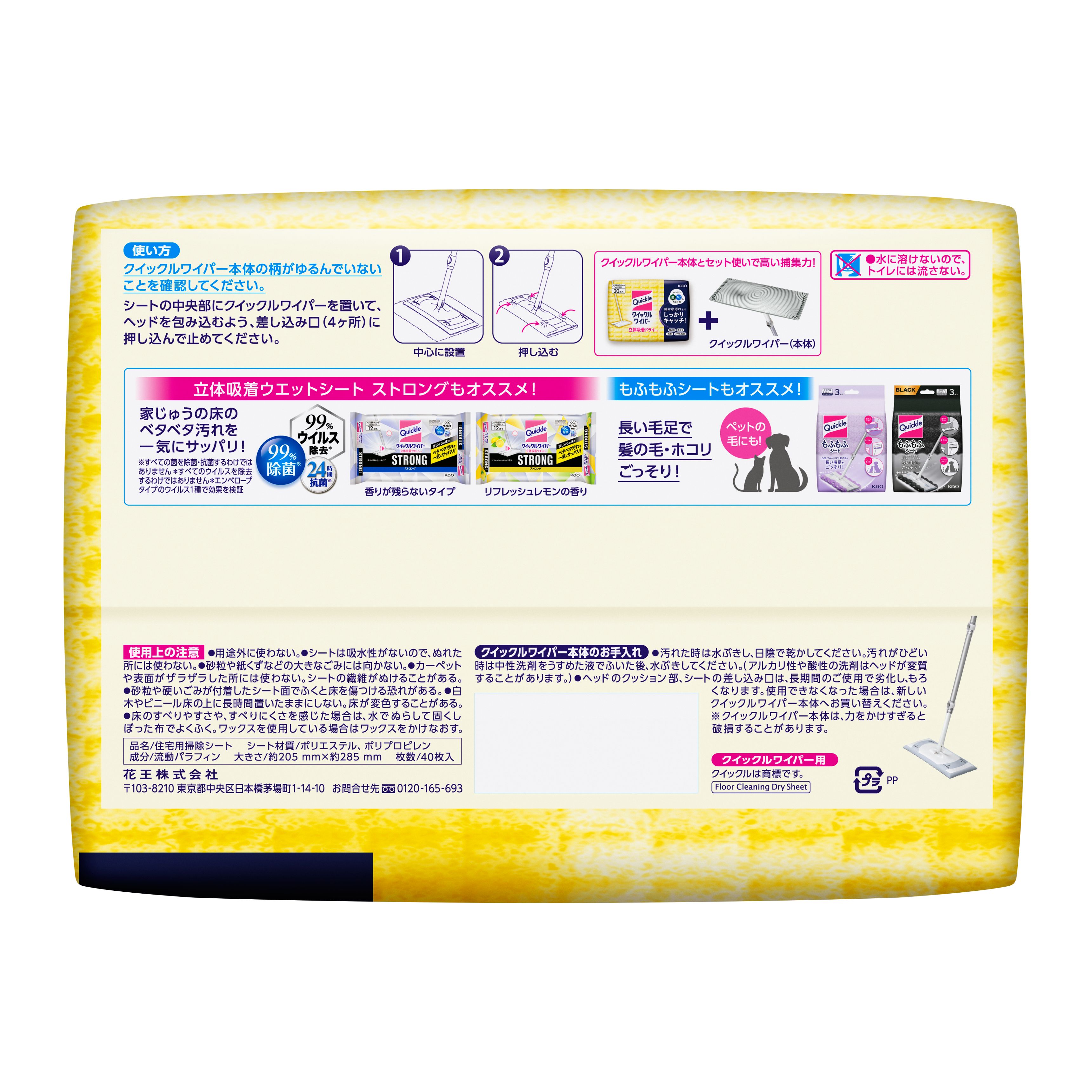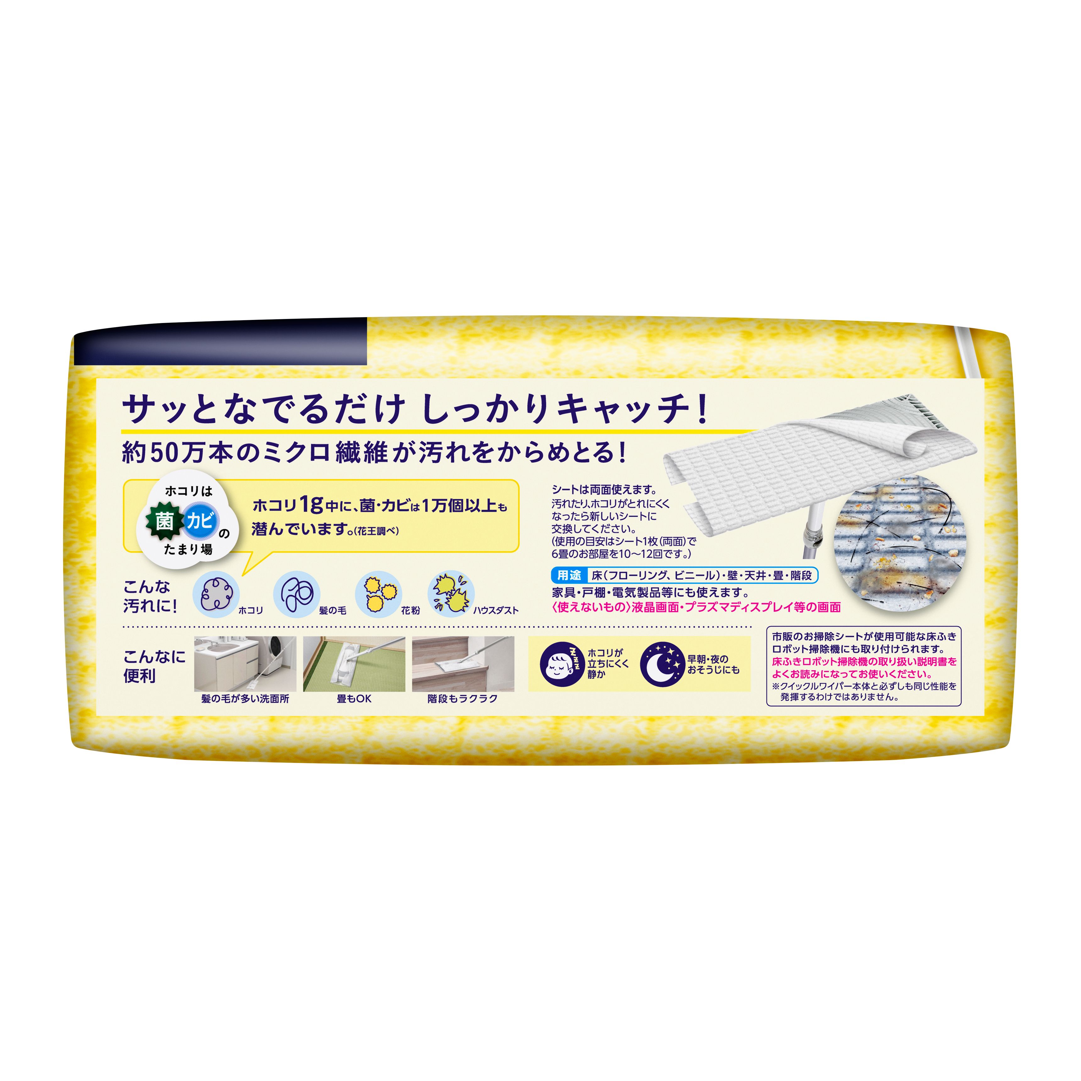 クイックルワイパーに取り付けて、フローリング・畳・ビニール床を立ったままラクにおそうじできるシートです。約50万本のミクロ繊維の立体構造シートで、髪の毛、ホコリはもちろん、静電気等ではりついた掃除機ではとりきれないミクロ汚れまでからめとって離しません。長い髪の毛もしっかりからめとります。花粉や微細なハウスダストまでキャッチします。シートは両面使えて、6畳のお部屋を約10~12回おそうじできます。