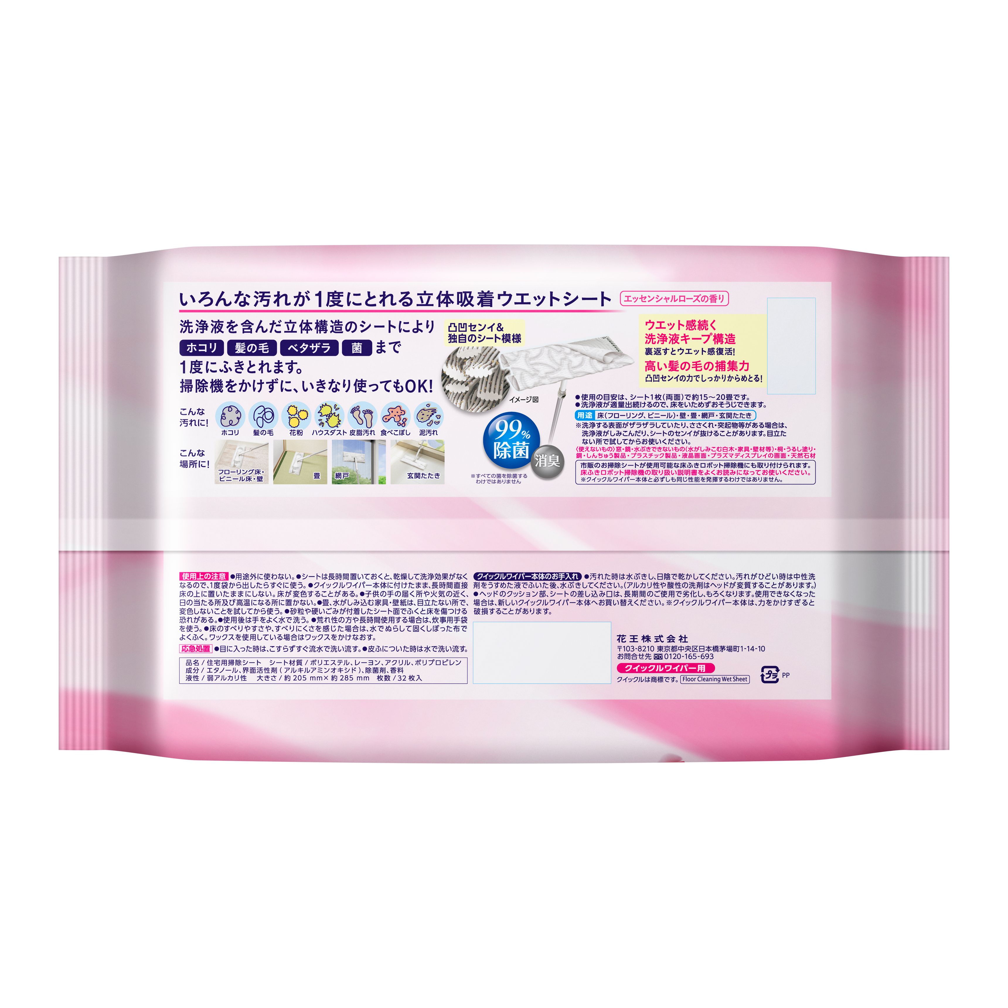 掃除機・雑巾がけが1度に!いろんな汚れが1度にとれる立体吸着ウエットシート。洗浄液を含んだ立体構造のシートにより、ホコリ・髪の毛・足裏汚れ・泥汚れまで1度に拭きとれます。掃除機をかけずに、いきなり使ってもOK!ローズの香り。1枚(両面)で約15~20畳をおそうじできます。