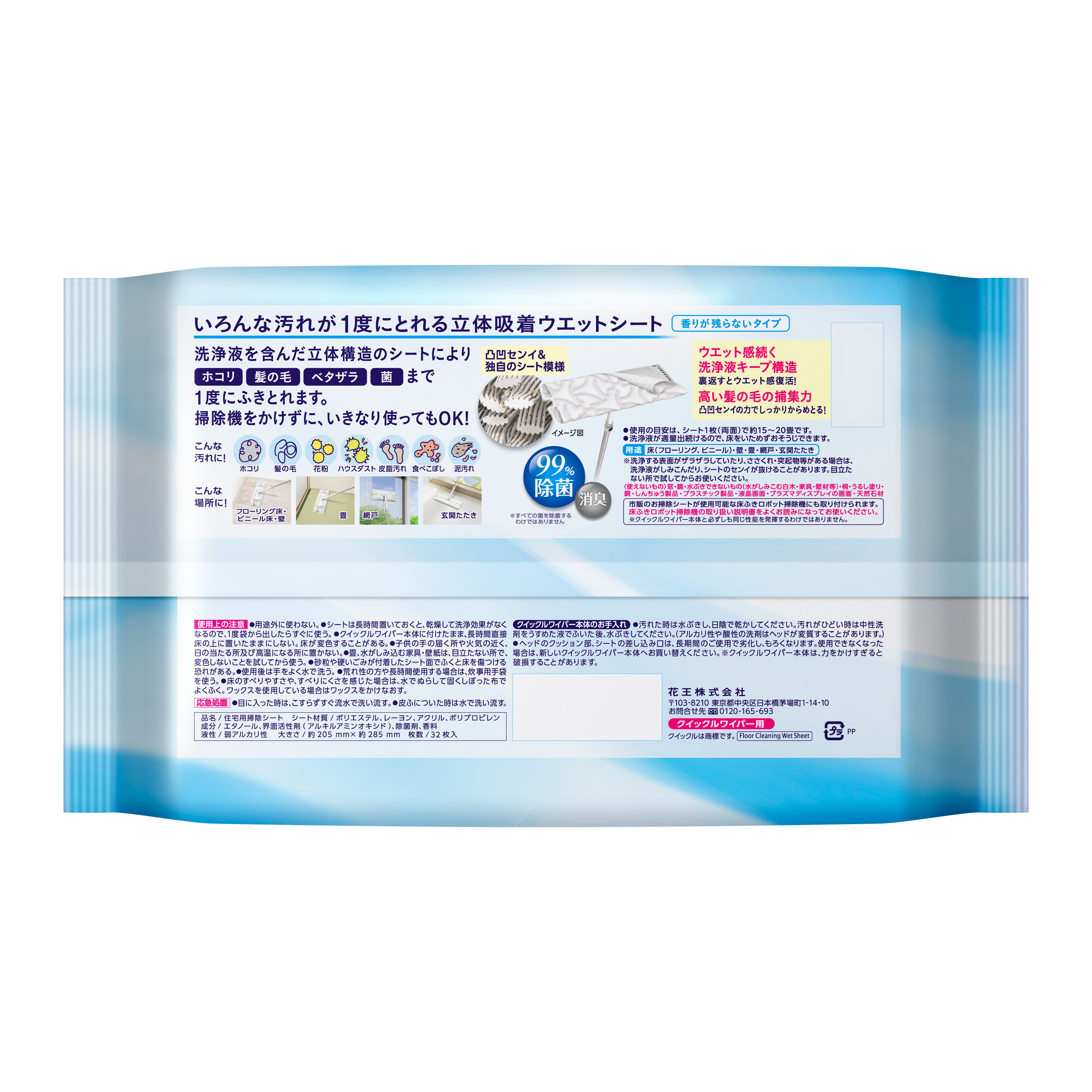 掃除機・雑巾がけが1度に!いろんな汚れが1度にとれる立体吸着ウエットシート。洗浄液を含んだ立体構造のシートにより、ホコリ・髪の毛・足裏汚れ・泥汚れまで1度に拭きとれます。掃除機をかけずに、いきなり使ってもOK!香りが残らないタイプ。1枚(両面)で約15~20畳をおそうじできます。