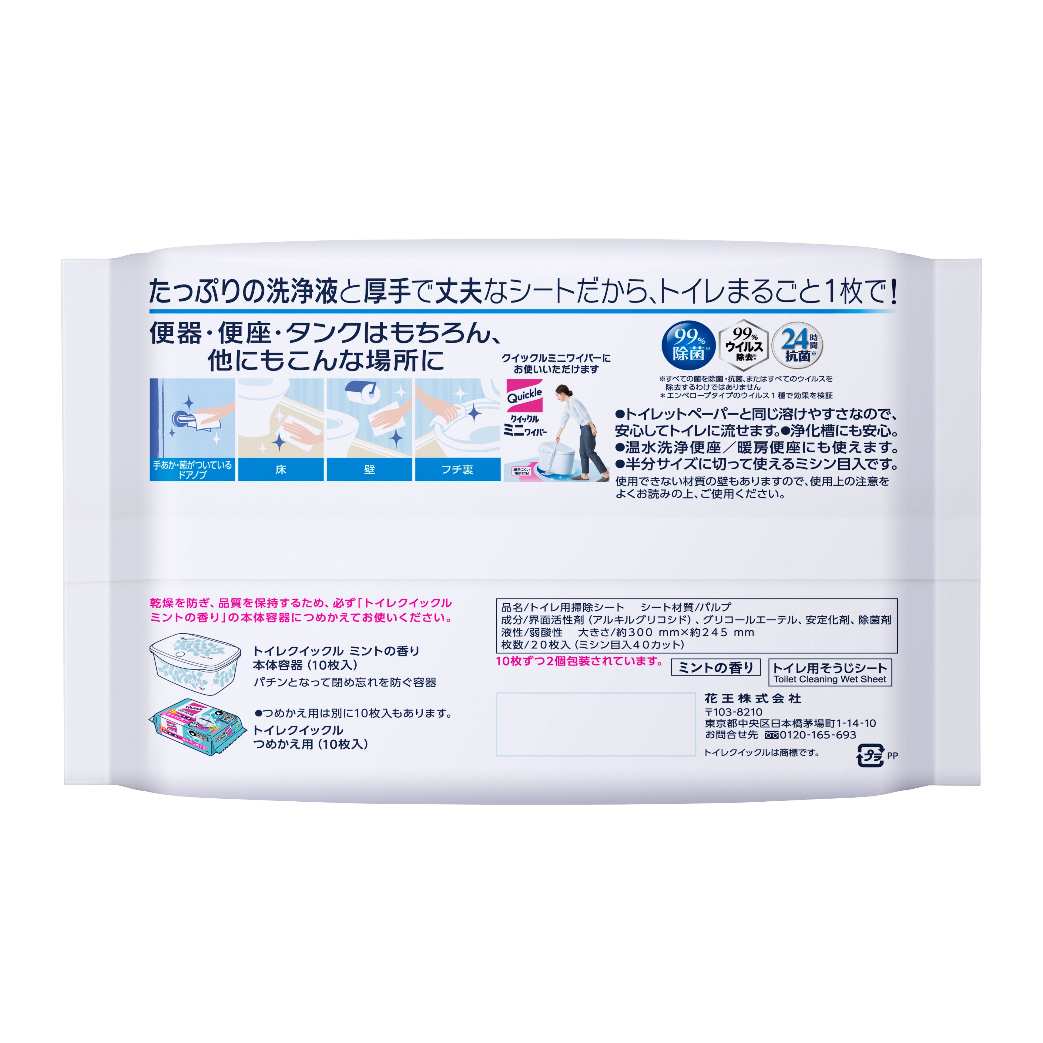 たっぷりの洗浄液で、便器から床まで汚れをスッキリ落とせるトイレ用お掃除シートです。厚手で丈夫なので、汚れが手につかず、安心してお掃除できます。除菌・抗菌※1に加え、ウイルス除去※2も。使用後はそのままトイレに流せます。すっきりとしたミントの香り。※1すべての菌を除菌・抗菌するわけではありません。※2すべてのウイルスを除去するわけではありません。エンベロープタイプのウイルス1種で効果を検証。