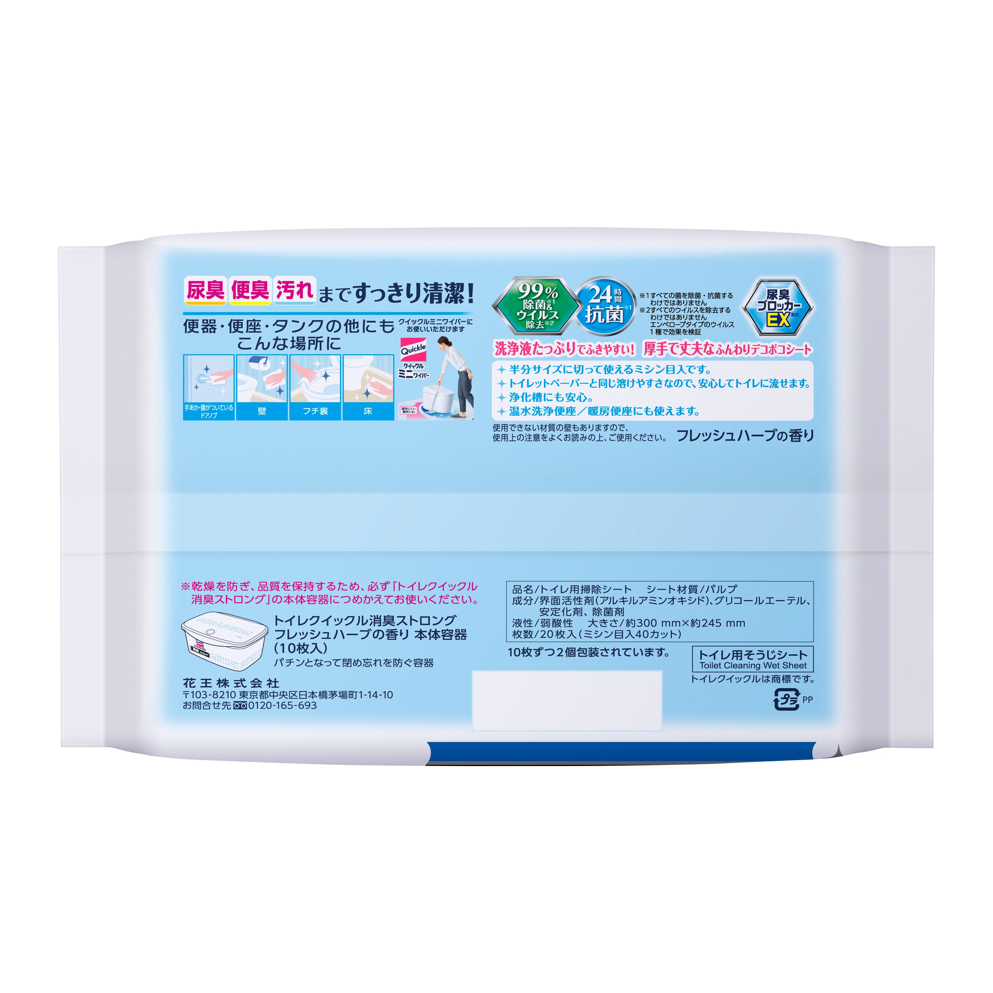 手強い尿臭・便臭もすっきり!これ1枚で便器から床・壁まで汚れをすっきり落とし、除菌もできるおそうじシートです。洗浄液たっぷりでふきやすく、厚手で丈夫なシートなので、汚れが手につきにくく、より広い面積を安心しておそうじできます。尿臭ブロッカーEX配合。フレッシュハーブの香り。使用後はそのままトイレに流せます。ポータブルトイレ(木製や、柔らかいタイプの便座を除く)や温水洗浄便座にも使えます。