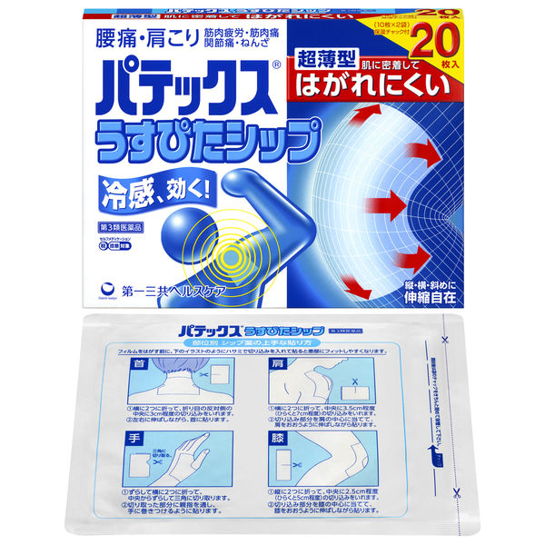 超薄型(約0.9mm)で衣類にからみつきにくく、しかも膏体がスミまでついているため、肌に密着してはがれにくいシップ剤です。