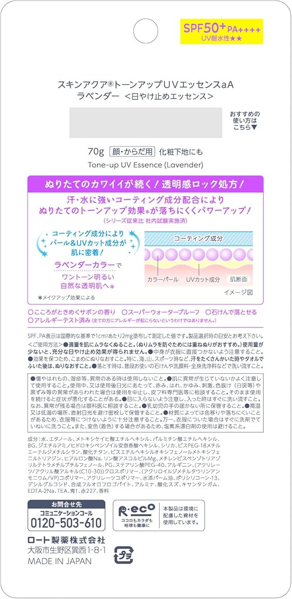 「スキンアクア トーンアップUVエッセンス ラベンダー」は、UVカットしながら、あなただけの透明感※1を引き出すラベンダーカラーの顔・からだ用日やけ止め。汗や水に強いコーティング成分を配合してリニューアル。