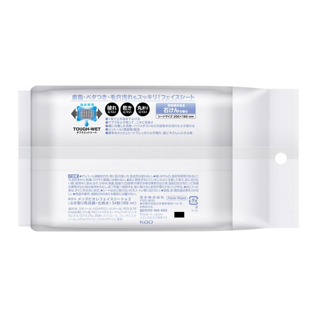 皮脂・ベタつき・毛穴汚れもスッキリ!独自開発の「タフウエットシート」採用で、丸まりにくい・乾きにくい・破れにくいフェイスシート!1枚で上半身までふける。アブラをふき取って、ニキビを防ぐ。顔に付着した花粉・ハウスダストなどの空気中の汚れもふき取れる。メントール(清涼剤)配合。厚手のメッシュシートでしっかりふき取れ、肌にやさしいふき心地。清潔感のある石けんの香り。