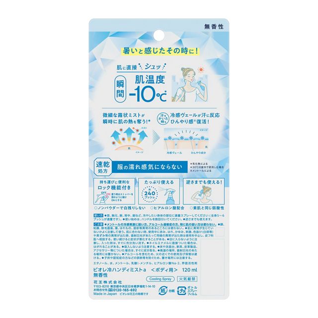 暑いと感じたその時に!シュッと肌に浴びた瞬間、肌温度-10℃(※)。※気化熱による※30℃の屋外で使用した場合。微細な霧状ミストが、瞬時に肌の熱を奪います。冷感ヴェールが肌にとどまり、汗に反応してひんやり成分(*)を放出。暑くてまた汗ばんでも、心地よいひんやり感がスッと肌に戻ってきます。*メントールによる。速乾処方で服の濡れ感気にならない。持ち運びに嬉しいロック機能付き。無香性。