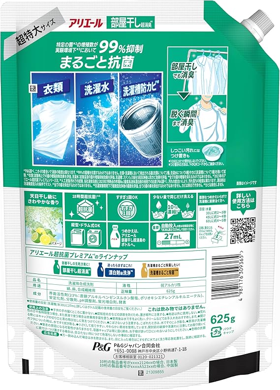 *1 P&G調べ。ニオイの度合いで消臭の程度は異なります。 *2 アリエール超抗菌プレミアムシリーズにおいて。 *3 全ての菌の増殖を抑えるわけではありません。 *4 カビは除去しません。 *5 2023年のアリエール超抗菌プレミアムシリーズ比。