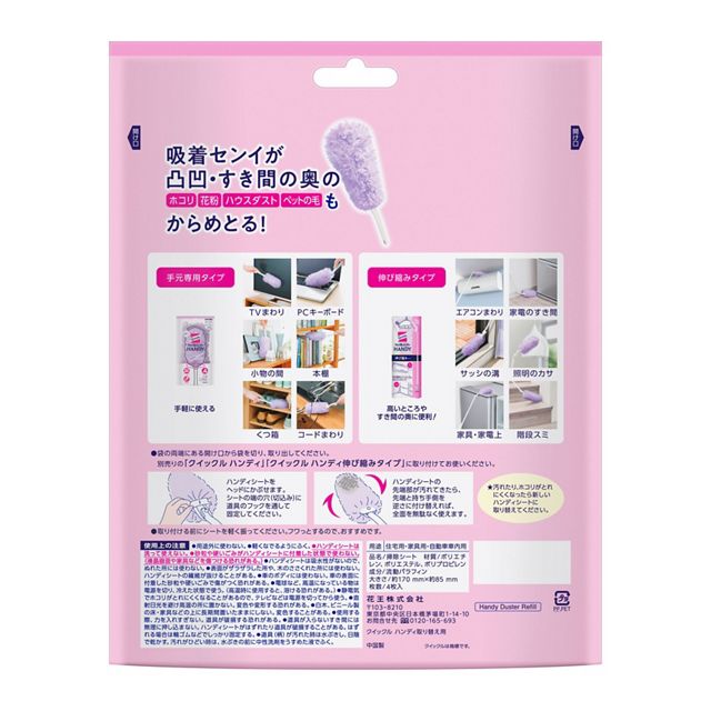 吸着センイが凸凹・すき間の奥のホコリ・花粉・ハウスダストもからめとる!PC/TVまわりや本棚、小物の間、サッシの溝など、色々な場所に使えます。クイックルハンディ・クイックルハンディ伸び縮みタイプ、どちらにも使えます