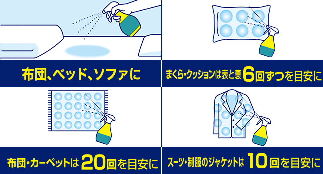 肌に触れる衣類やお子さまのいる家庭での使用もOK布団、ベッド、ソファにまくら・クッションは表と裏6回ずつを目安に 布団・カーペットは20回を目安に スーツ・制服のジャケットは10回を目安に