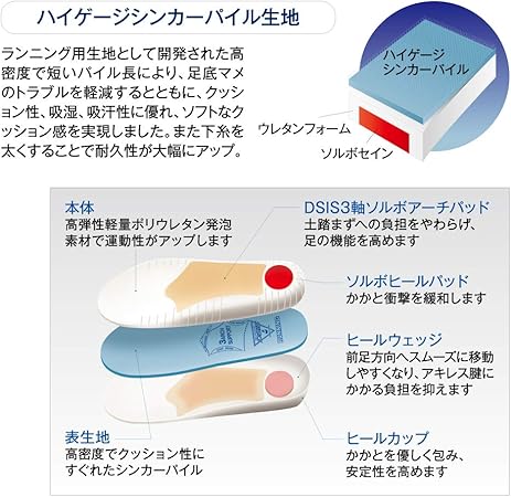 ランニング専用インソールの表生地として開発されたハイゲージシンカーパイルが足底マメを防ぎ、3つのアーチを支えて正しく安定したフォームで長時間走ることが出来るDSISインソール。