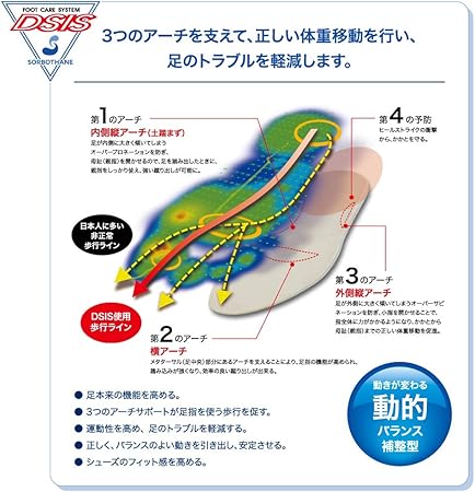 DSIS内側タテアーチ:母趾をしっかり開かせて、曲げやすくすることで確実な踏み込みを実現。足、膝への負担を軽減する。