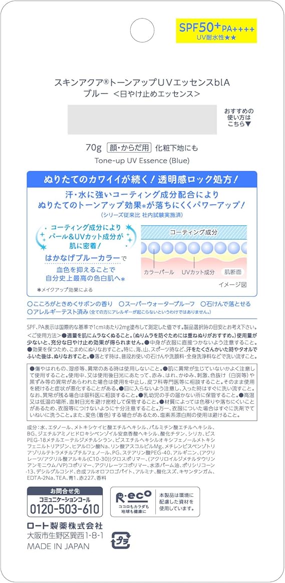 「スキンアクア トーンアップUVエッセンス ブルー」は、UVカットしながら、血色感を抑えて自分史上最高の色白肌(※1)を演出するブルーカラーの顔・からだ用日やけ止め。