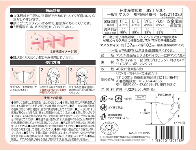 【成分】 本体・フィルター部:ポリプロピレン 耳ひも:ポリエステル、ポリウレタン