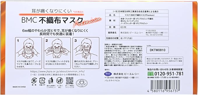 【BMC】不織布マスク プレミアム 1日使いきりタイプ ふつうサイズ 60枚入