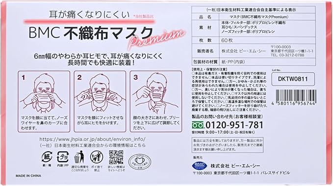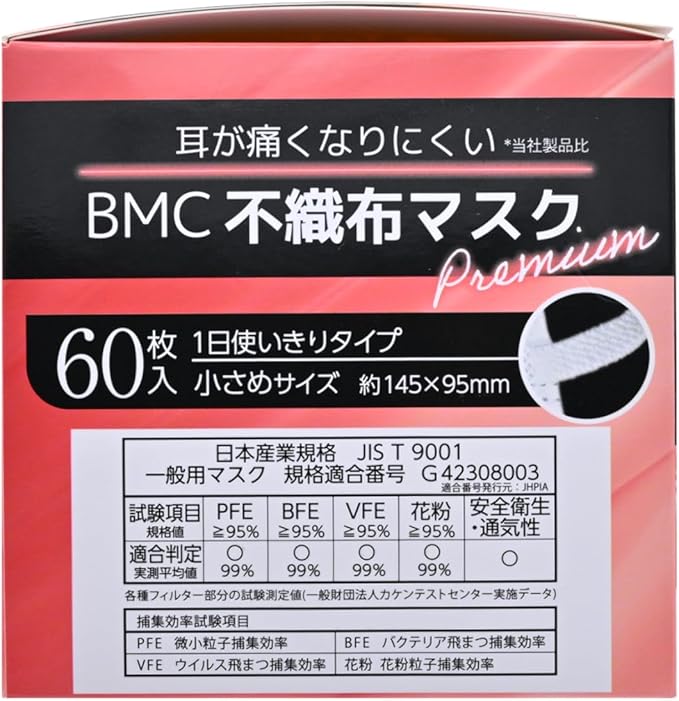 【BMC】不織布マスク プレミアム 1日使いきりタイプ 小さめサイズ 60枚入