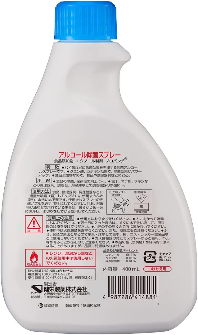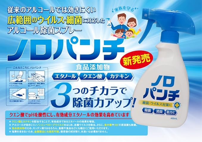 「ノロパンチ」は、従来のアルコールでは効きにくい広範囲のウイルス・細菌に対応したキッチン用除菌アルコールスプレーです。