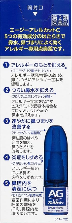 1.抗アレルギー剤「クロモグリク酸ナトリウム」が、アレルギー誘発物質の放出を抑え、つらいアレルギー症状を緩和します。