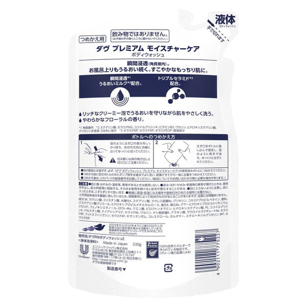 ●他の製品とは混ぜず、必ず、「ダヴ ボディウォッシュ プレミアム モイスチャーケア」の使用済みボトルにつめかえてください。