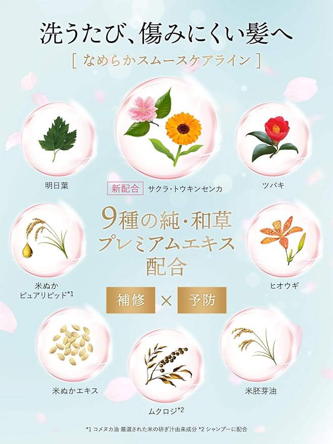 ●指通りなめらかな絹髪に仕上げます。※日本の髪を本質から考える。:日本の風土や気候などの環境に合わせたヘアケア方法を研究しています。 ※1米胚芽油、サクラ、トウキンセンカ、米ぬかピュアリピッド(コメヌカ油厳選された米の研ぎ汁由来成分)、米ぬかエキス、明日葉、ムクロジ(シャンプーに配合)、ヒオウギ、ツバキ※2ラウロイルサルコシンTEA、ラウロイルメチルアラニンNa